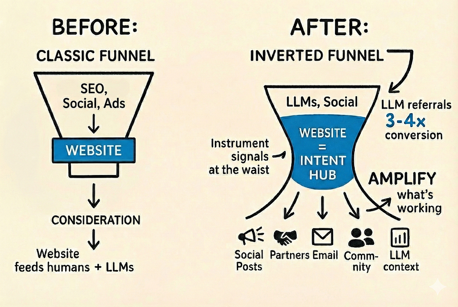 This is the inverted funnel. Your website used to be the wide mouth at the top. Now it’s the narrow point where intent concentrates. The visitors who make it there carry real signal which is why LLM referral traffic converts 3-4x higher than traditional organic search.